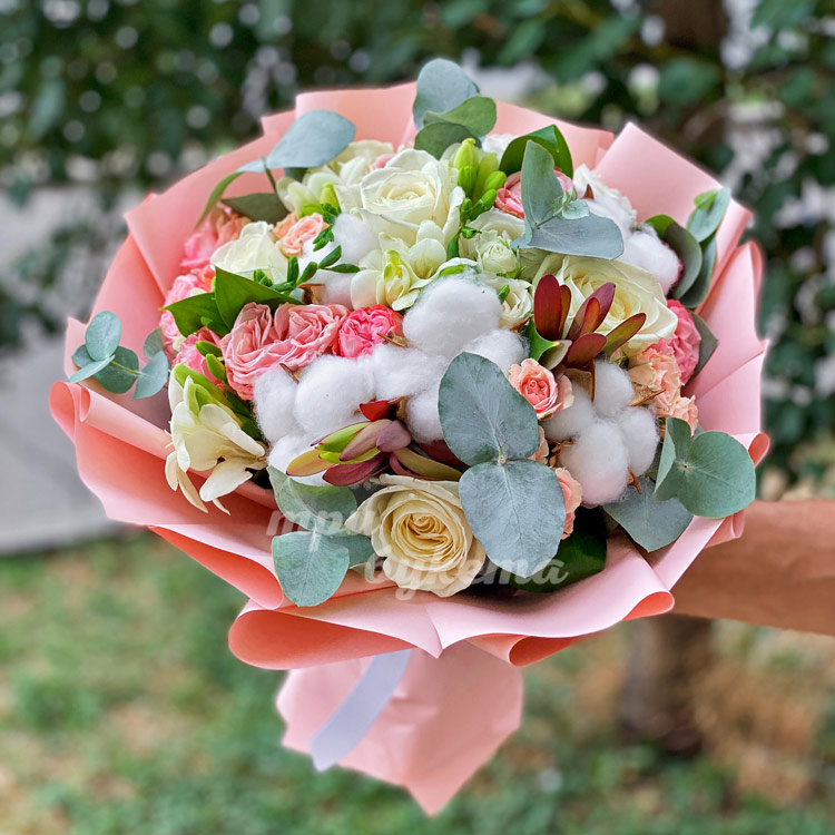 Букет цветов с хлопком и эвкалиптом
