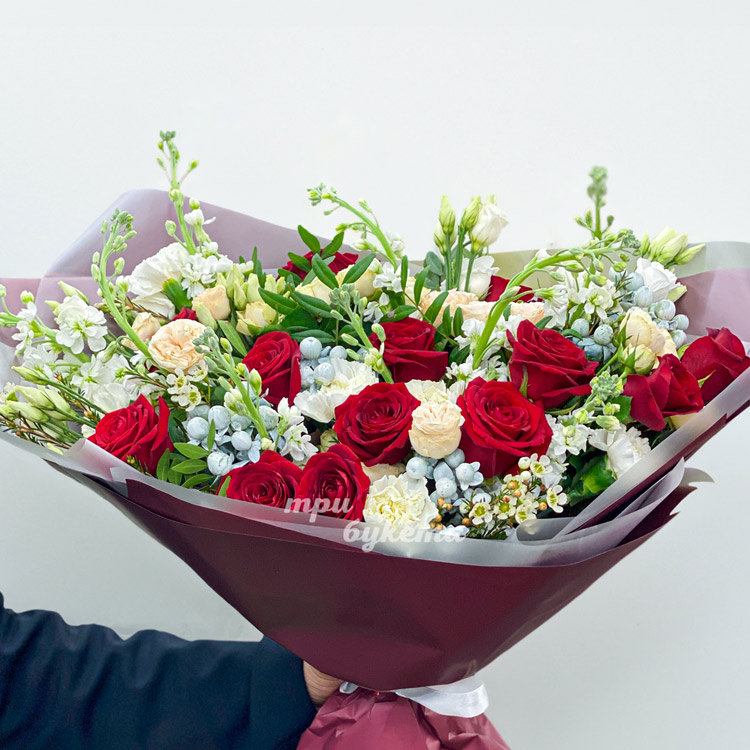 Букет красных роз, белых маттиол и зелени