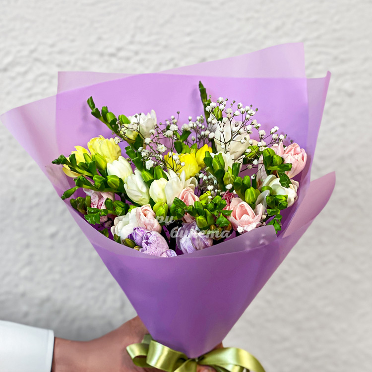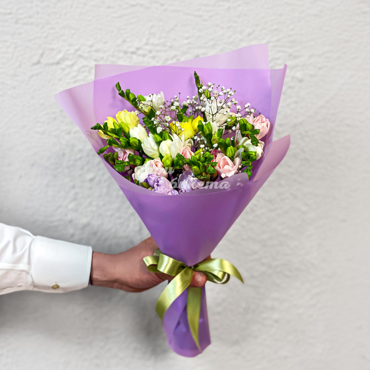 Букет окращенных фрезий с гипсофилой