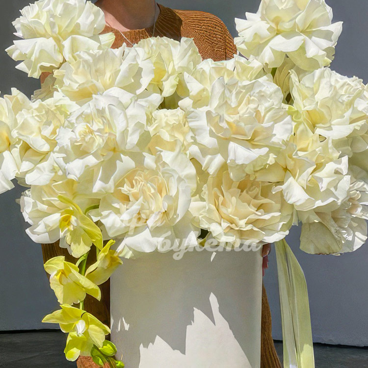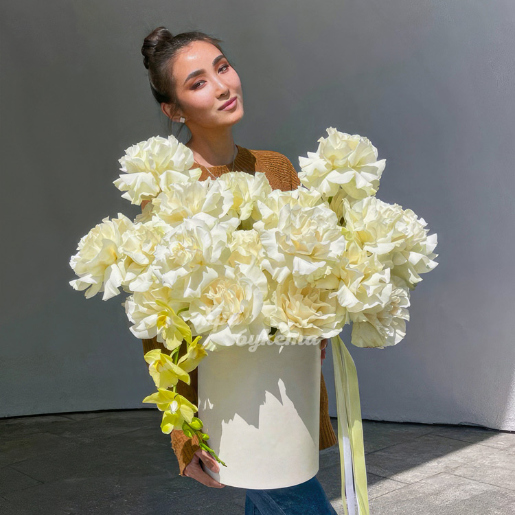 Коробка белых французских роз с орхидеями
