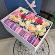 Коробка красных роз с леукадендронами