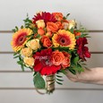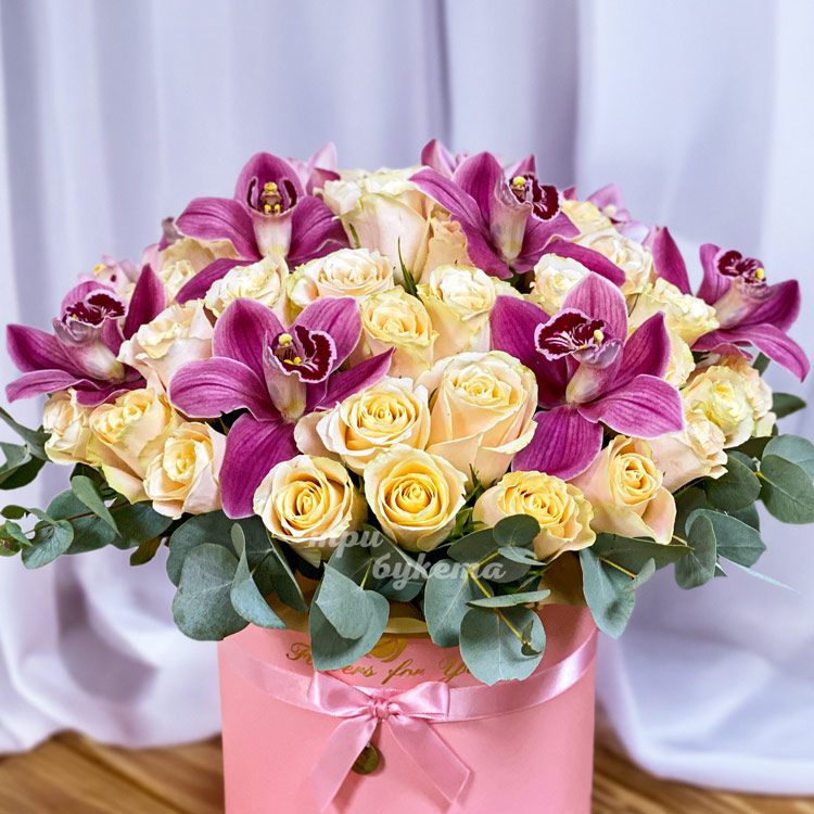 Коробка кремовых роз и бордовых орхидей