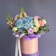 Коробка розовых французских роз и хризантем