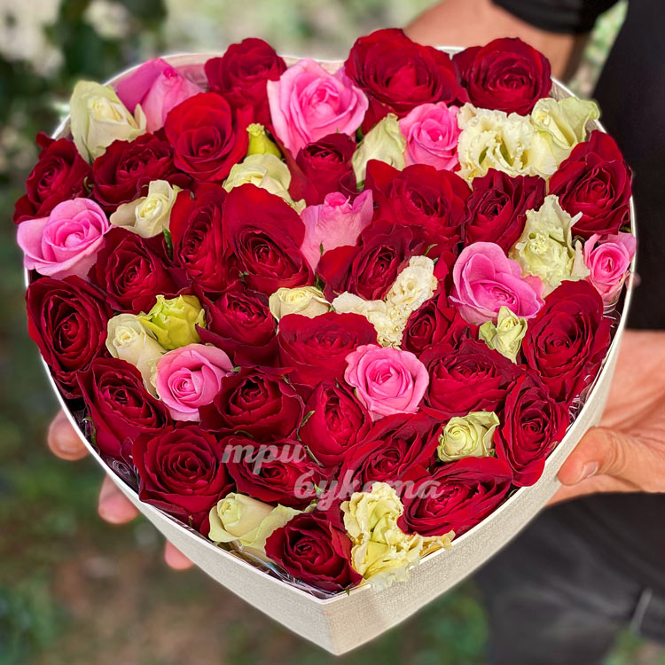 Коробка-сердце красных и розовых роз