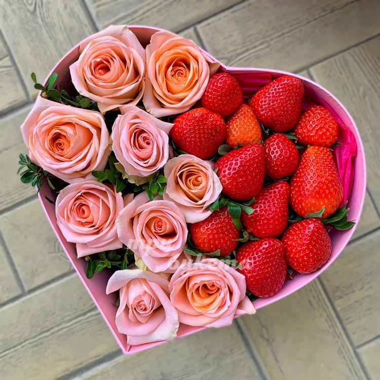 Коробка-сердце с розами и клубникой