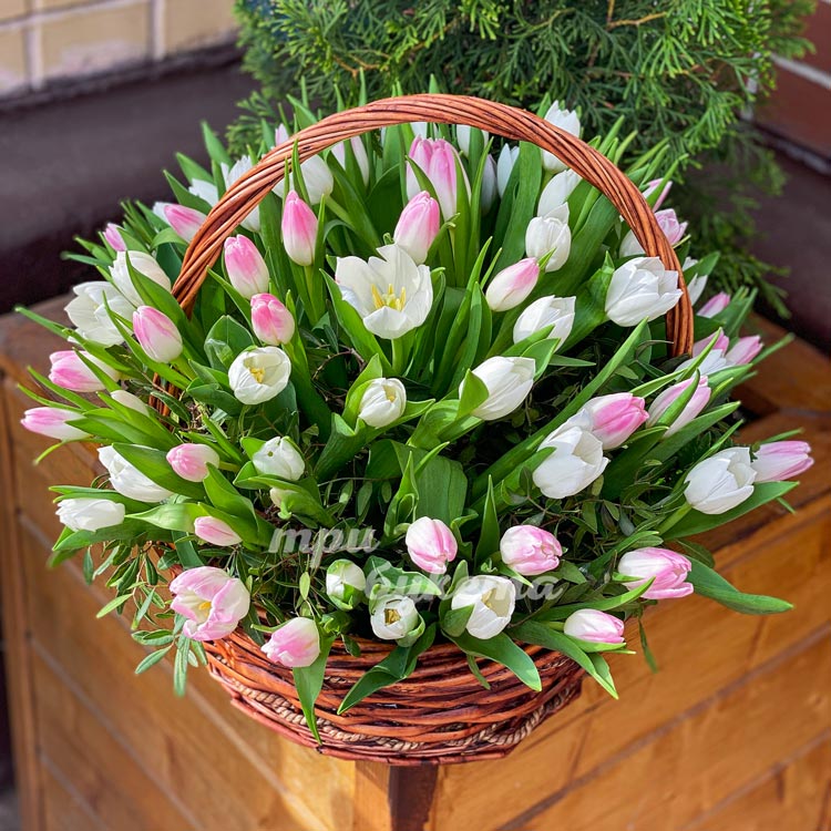 Корзина белых и розовых тюльпанов