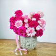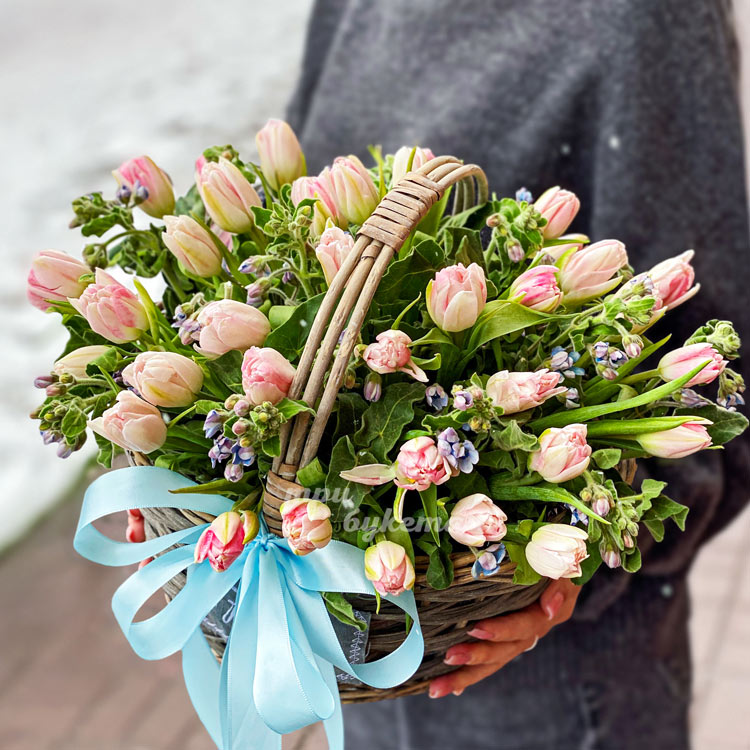 Корзина розовых тюльпанов с оксипеталумом