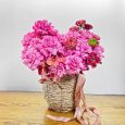 Корзина ярких роз с гипсофилой и лимониумом
