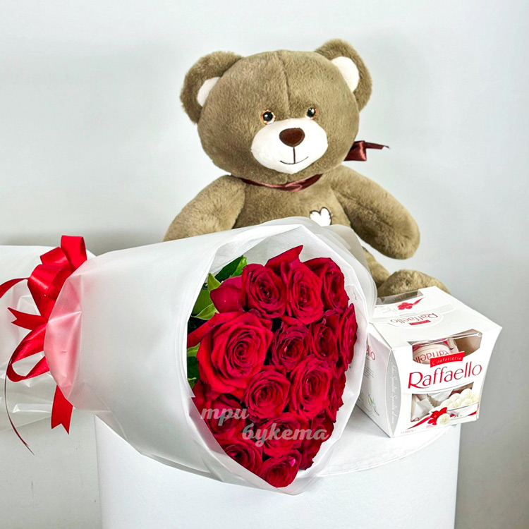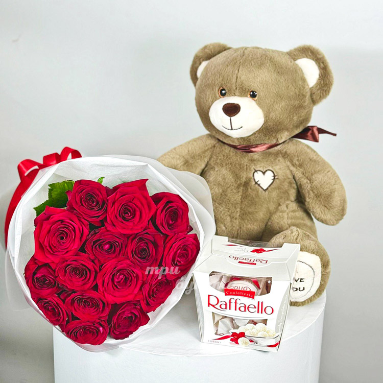 Набор из мягкой игрушки, конфет и 15 красных роз