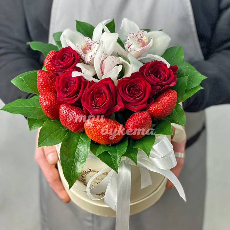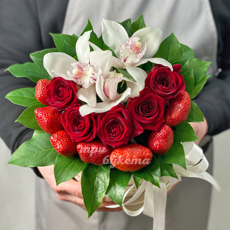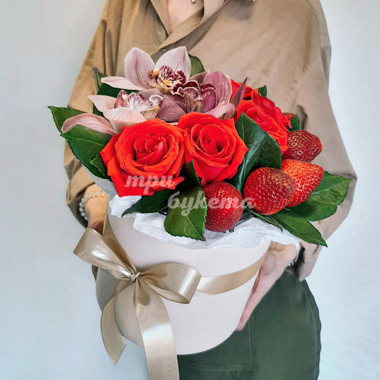 Орхидеи, розы и клубника в коробке