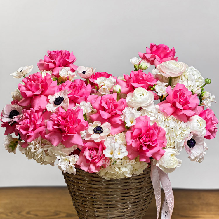 Розовые розы с белыми анемонами в корзине
