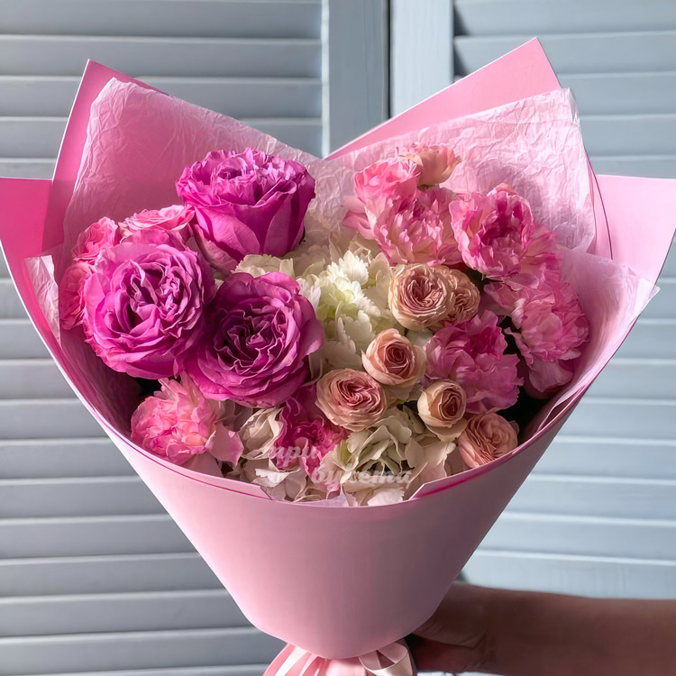 Розовый букет гвоздик и роз с гортензией
