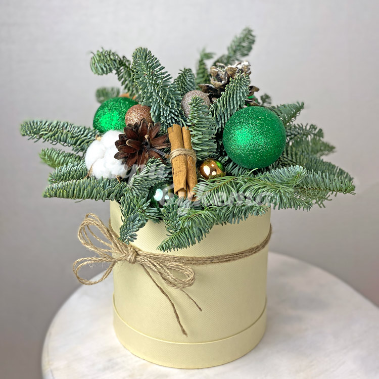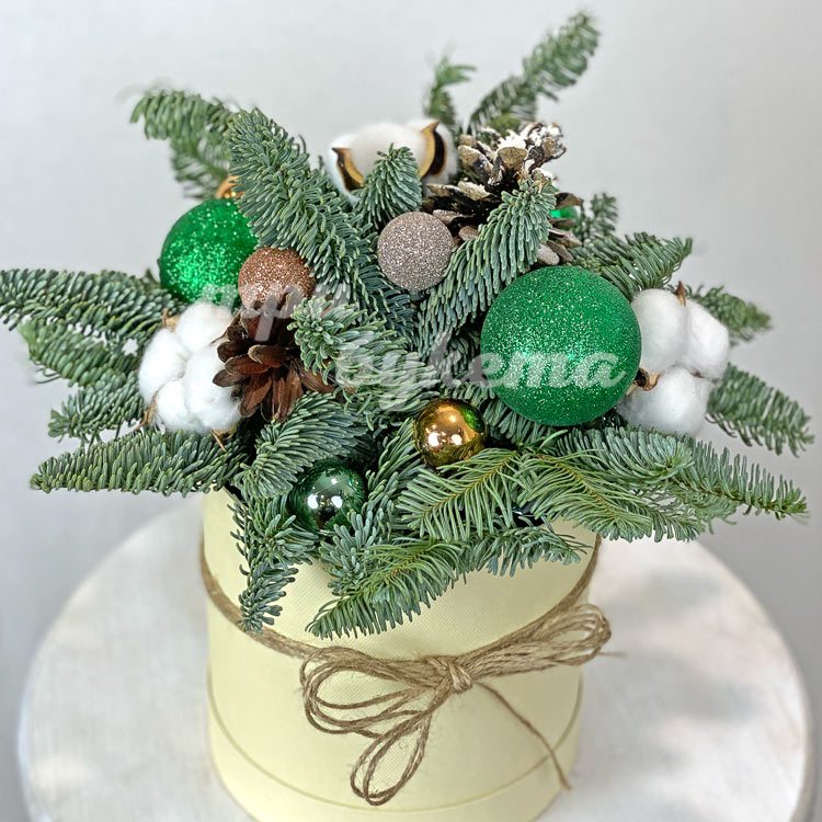 Зеленые шарики и хлопок в коробке